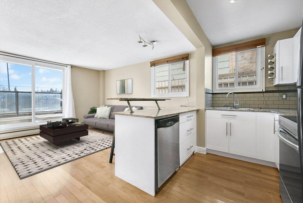 NEW PRICE! The ELAN in Bankview! This spacious 2-bed, 1-bath main-floor condo combines modern updates with unbeatable walkability. The open-concept layout is brightened by side windows and a large patio door, leading to a private 12' x 8.5' glass-enclosed patio. The kitchen offers granite counters, updated cabinetry, raised eating bar, and stainless steel appliances—including a new smart oven/stove with WiFi and over-the-range microwave. The bathroom is finished with granite and a 22" deep soaker tub. Both bedrooms are generously sized, and a built-in granite desk off the foyer makes working from home seamless. Additional features: HW floors, in-suite laundry, central vacuum & attachments, extra storage, & assigned locker. The CONDO FEES include ALL utilities (even electricity)!! Located steps from 17th Avenue’s top restaurants, bars, parks, and schools, this property is ideal for both investors and first-time buyers. Book your showing today and step into Bankview living.